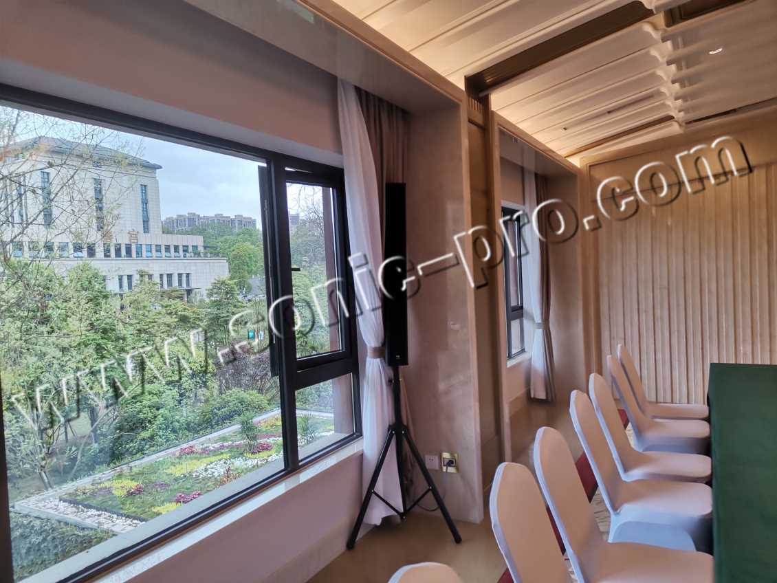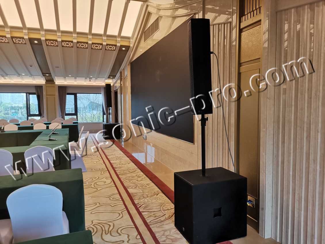 本场合音箱采用线性音柱来进行扩声,线性音柱喇叭全部采用小尺寸的钕磁单元,加上两分频号角的设计,尤其在会议人声可以完美还原,让发言人在开会时声音更通透,讲话