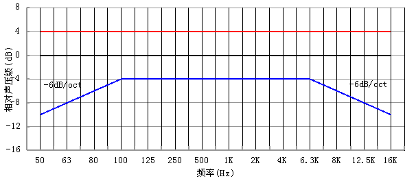 ≥103dB | 以100~6300Hz平均声压级为0dB,在此频带内允许±4dB的变化; 50~100Hz和 6300~12500Hz的允许范围见图1.2.1 |