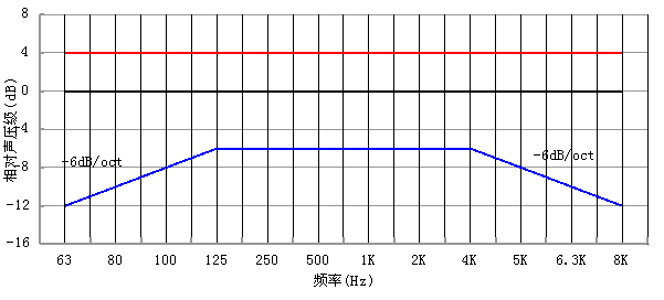 ≥98dB | 以 125~4000Hz的平均声压级为OdB,在此频带内 允许范围: -6dB~+4dB; 63 ~125Hz 和 4000~8000Hz的允许范围见图1.2.2 | 1000Hz、 4000Hz≤8dB | 125Hz~4000Hz≥-10dB | 500~2000Hz内1/1倍频带≥3dB | ≤NR25 |