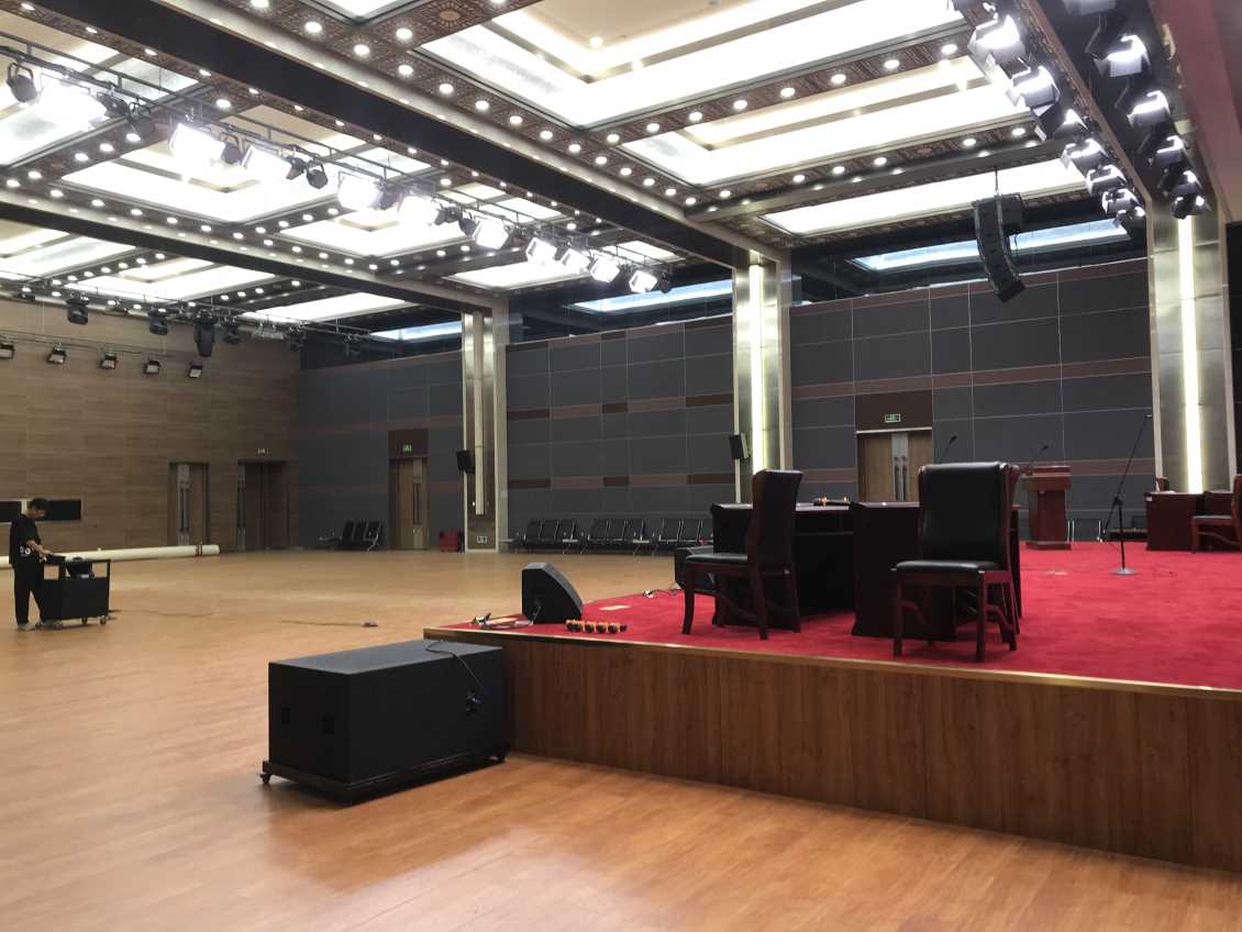 由于该礼堂面积较大,需要实现远距离,大声压的扩声,所以在音箱的选择上,我们设计了四加一的线性阵列音箱组,采用专用田字架吊挂在舞台前两侧。