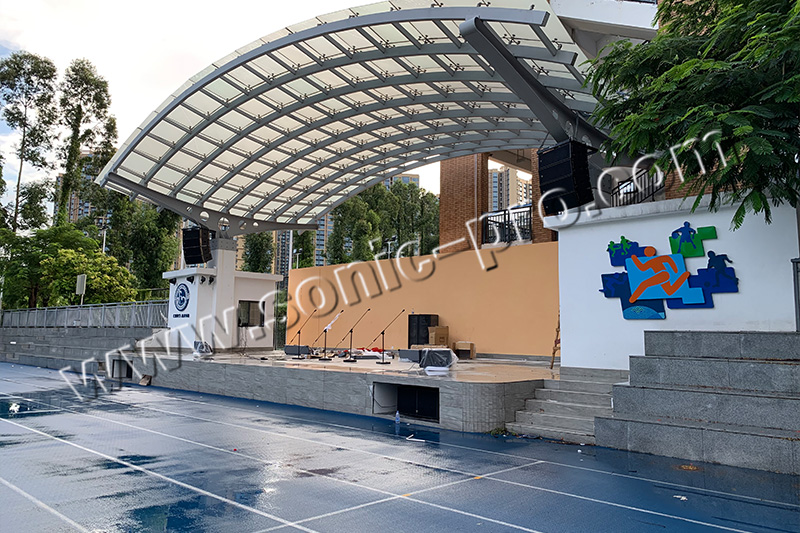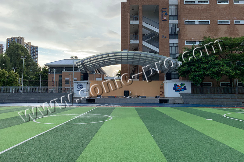 案例介绍: 学校操场扩声音响扩声,要满足日常升旗运动会广播以及演出活动需求,需考虑扬声器声场声压的均匀度和声音的清晰度。