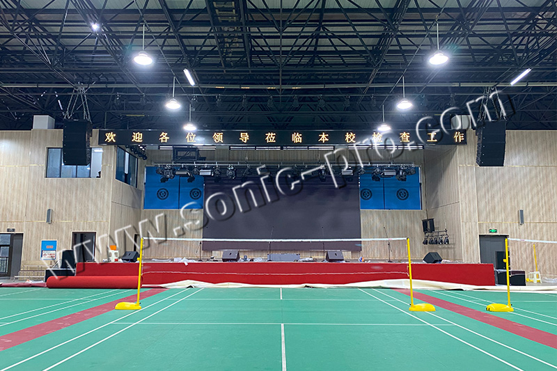该校体育馆方案设计。体育馆主要用于体育比赛和文艺演出等,考虑到体育馆作为一个较为人多且空旷的场所,甲方要求广西会议系统需要做到声音清晰、柔和、音质优良、观众席上有足够的响度,声音应覆盖整个观众席和表演场地,使声场均匀,系统有足够的稳定度。