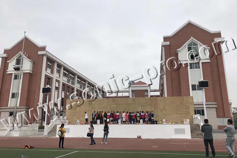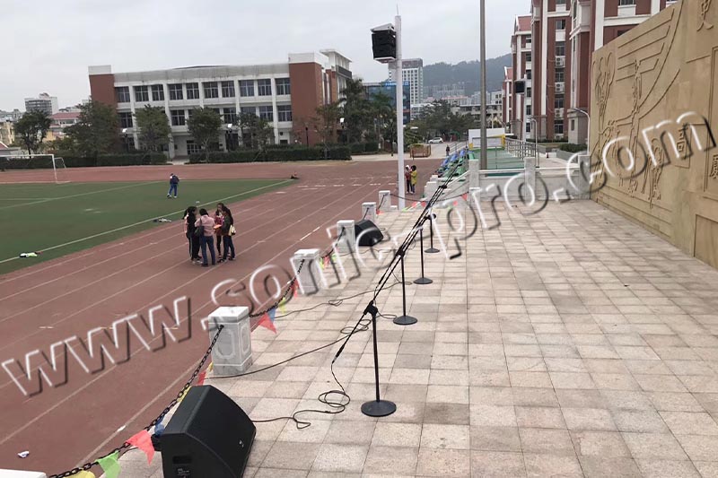 此次项目是该学校的户外操场,为保障整个操场的开会时和活动演出等扩声系统,提高学校的办学质量,学校主要采用了德国Sonic pro音响 LA系列线性音箱及MF系列专业舞台返听音箱等主要扩声设备以满足日常的扩声使用。
