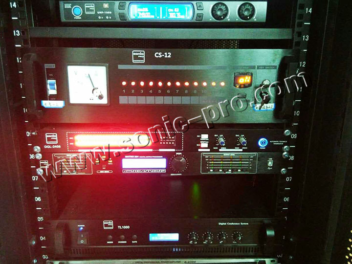 搭配2台具有高效转换率的4通道数字功放(D-4300),保证扩声能有足够能力,配合12路数字广西调音台(GL-24)、数字广西音频处理器(MATRIX 204)及智能反馈抑制器(DGL-2408)使得音色更加细腻出众,