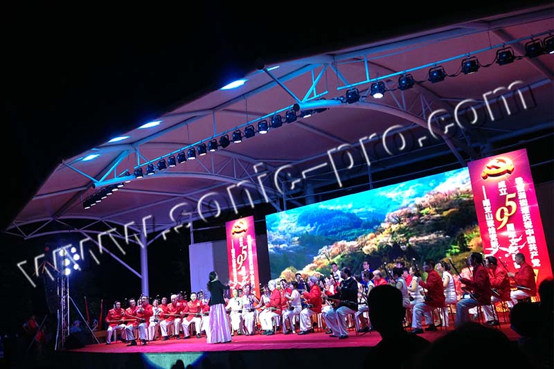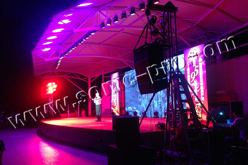 该项目主扩音箱采用8只高精度线性阵列扬声器系统LA系列线性阵列音箱(LA-210),LA系列音箱采用内置分频方式,经过严谨的调试,能充分有效的发挥音箱本身特点,箱体采用高强度桦木夹板,表面采用特殊材料喷涂制作,音箱上装备精密的铝合金吊挂系统,音箱与音箱之间的连接角度可通过吊装件来调节,采用最新人体工程学和机械设计,使整个系统安装快捷及保证了安全。TZ系列同轴音箱(TZ-18)、SUB系列超低音箱(SUB-218)、TB系列音箱(TB-15)作为辅助扩声以及舞台返听音箱。
