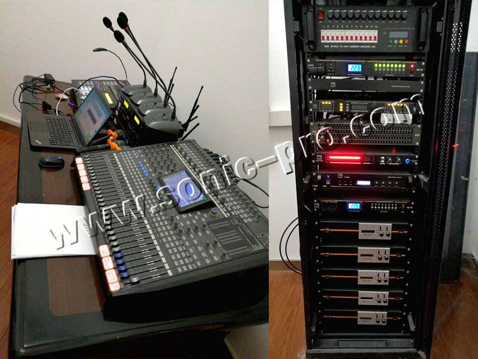 调音台采用小型化数字调音台(GL-16);搭配周边设备:反馈抑制器(DGL-2408)、音频隔离器(GL-202)、电源时序器(CS-10);音源部分采用无线会议话筒(XL900)。