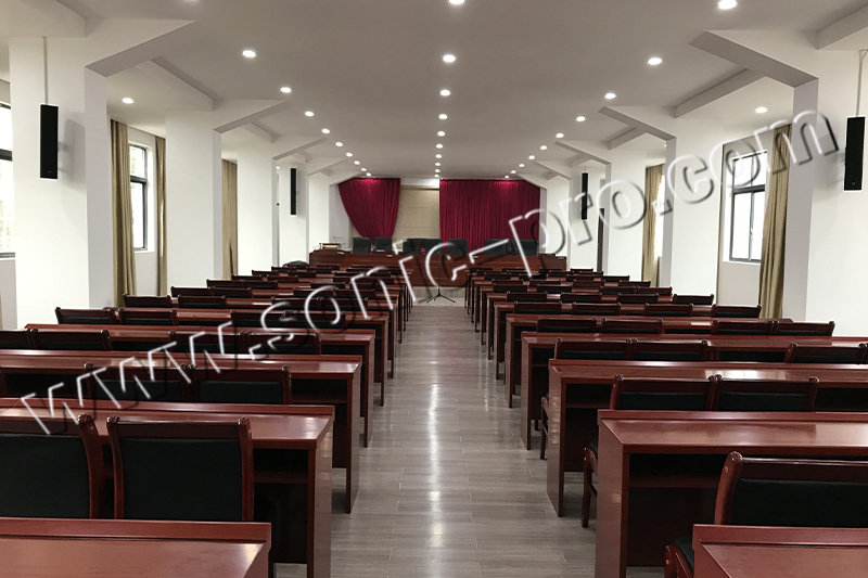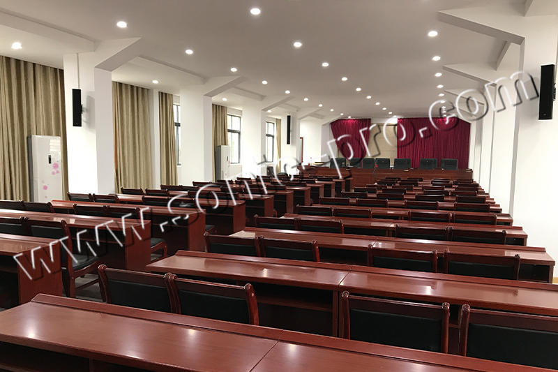 根据工程的需求,要使该会议室能达到良好的扩声效果,推荐使用TH线性音柱,分别安装在会议室四周进行近距离扩声。达到扩声面广、声清晰明亮,不易产生噪声。听众席有合适的响度。良好的声音自然