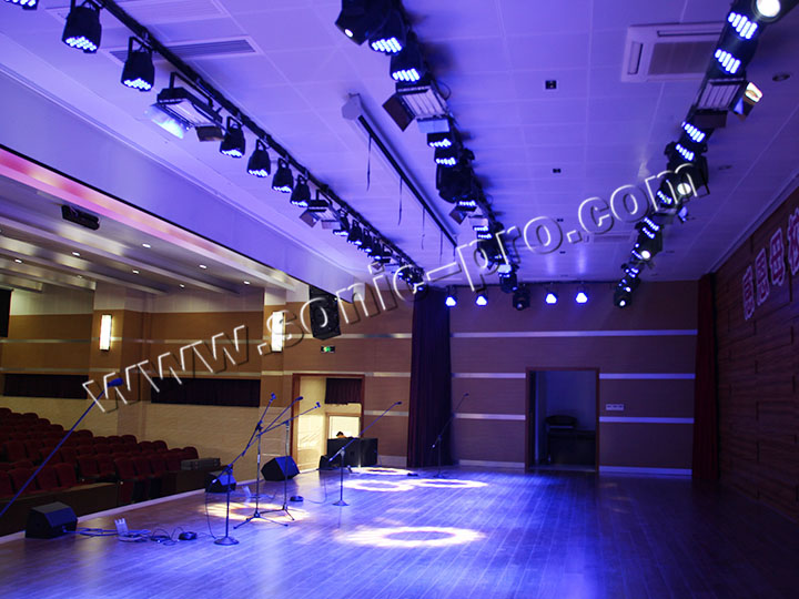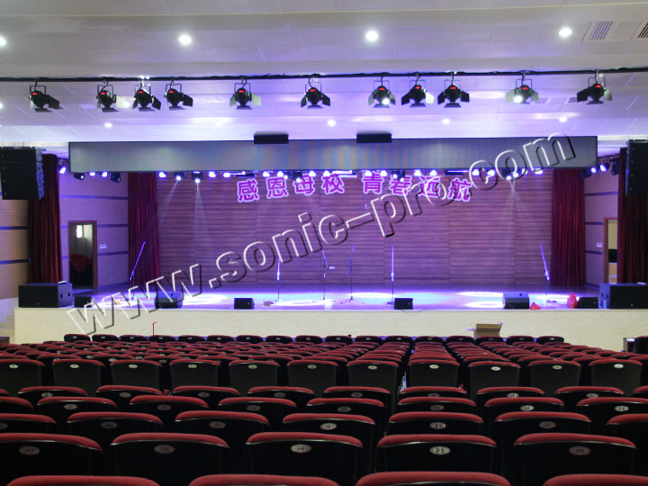 广西报告厅音响系统全部采用SONIC PRO(斯尼克)音响,左右声道扬声器组各由4只双10寸线性阵列音箱(LA-210) ,以吊挂安装扩声方式实现全频扩声,线性阵列音箱具有音质优美,传输距离远,声压级大的特点,适合大型厅堂扩声需求。同时采用4只8×3寸线性音柱(TH-803)作为中央通道扩声,确保中场区域扩声的直达声;另外,设计了2只双18寸的低音音箱(SUB-218)作为全场扩声的低频下潜及能量的补充,可以满足各类文艺演出表演的低音需求。为进一步确保均匀的声压级,增加了4只12寸同轴音箱(TZ-12)作为会议扩声使用时舞台后场观众席的扩声;台唇音箱采用4只8寸的音箱(K-8),舞台返听部分,根据舞台的面积,设计了2只12寸音箱作为舞台表演人员监听。