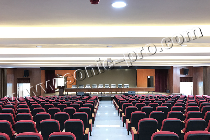 作为报告厅扩声,音箱主要考虑吊装,因为这样直达声较好,且不影响场地。本案例是在场所两侧墙上各吊装K系列音箱作为报告厅主扩声,K系列音箱以人性化设计为起点,声音如同其外型,每个细节表现得自然洒脱而不拖泥带水,音色通透,空间感和声音质感非常出色。