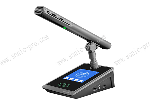 显示屏:话筒自带4.1吋全彩高清触摸屏,显示内容清晰,可以显示当前话筒发言或待机状态、当前时间、单元类型(代表单元、主席单元、VIP单元)、ID、发言计时、音量、日期时间等,可通过触摸屏控制话筒开关(与触摸按键同步)、调整屏幕亮度、语言选择(繁体中文、简体中文、英文)、VIP选择、待机时钟(可显示当前日期时间)、关于话筒信息查看、待机图片选择(可根据用户需要定制如:国徽、党徽、校徽、单位LOGO风景图画等)、服务呼叫选择(技术人员、抽纸、秘书、水、笔、茶、纸、咖啡,可定制其他用户需求功能)、清晰了解当前的使用情况;